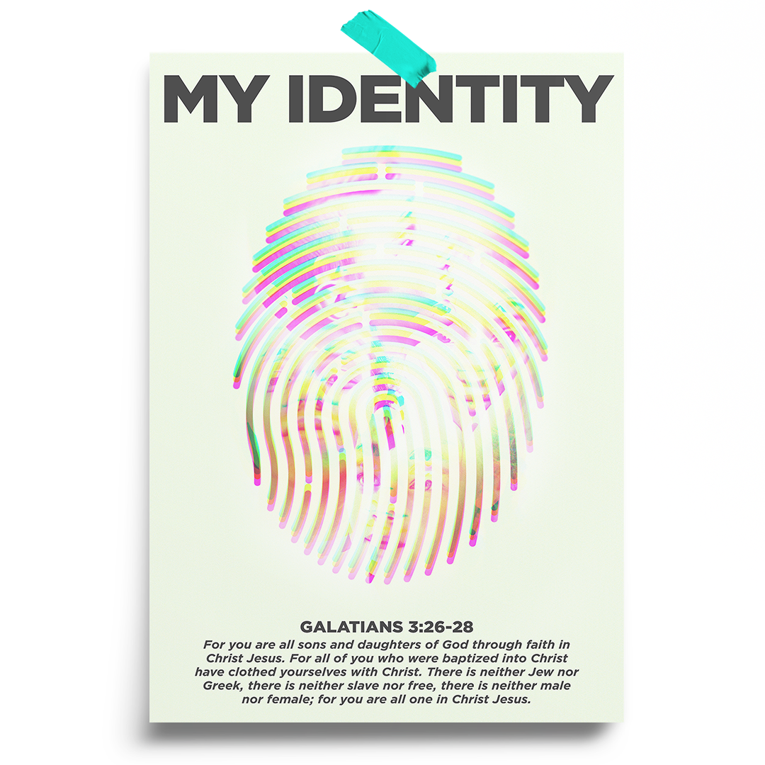 A clean, modern design created to visually reflect Galatians 3:26–28. The iridescent fingerprint symbolizes individuality and belonging, making the piece ideal for sermon visuals, youth ministry printables, or discipleship materials.